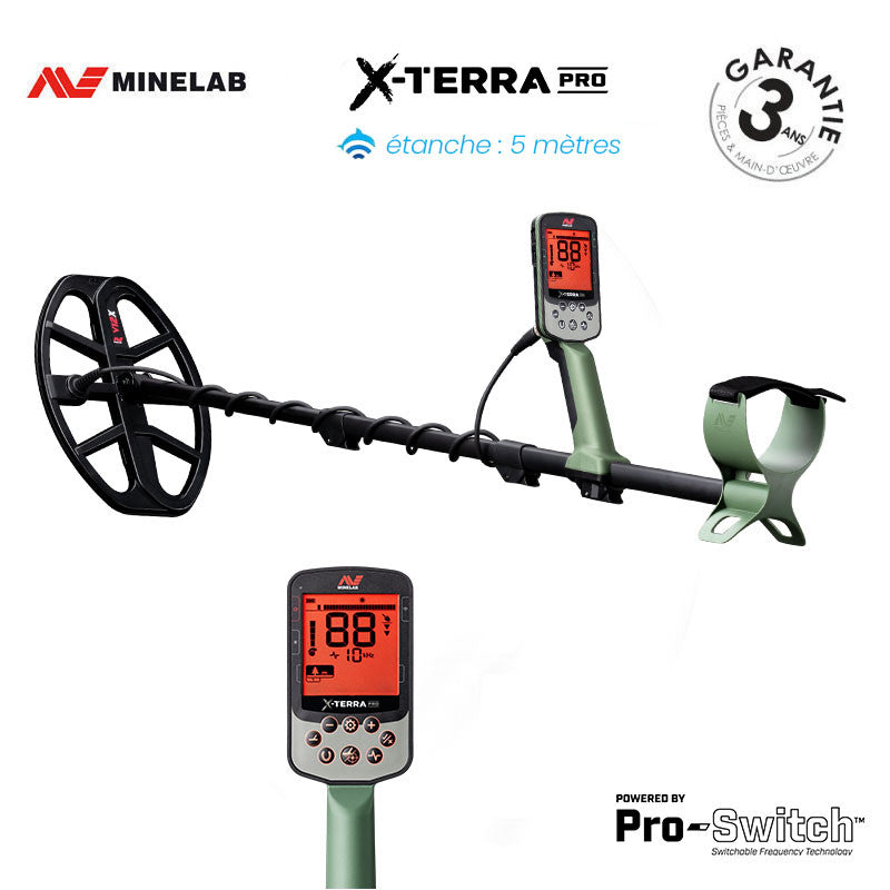 La technologie Minelab Pro-Switch est une fonctionnalité innovante qui permet de changer facilement et un seul clic, la fréquence de détection sans avoir à changer de disque de détection ou de programme. Le X-Terra Pro propose 4 fréquences de détection différentes allant de la basse fréquence, idéal pour les terrains propres et la recherche de cible en profondeur à la haute fréquence, parfait pour la recherche de petites cibles sur terrain minéralisé. Avec la technologie Pro-Switch, vous pouvez basculer d’une fréquence à l’autre en appuyant simplement sur un bouton. Cette fonctionnalité permet de s’adapter facilement aux conditions de terrains et utile pour les prospecteurs qui cherchent à détecter différents types de cibles sur un même terrain.